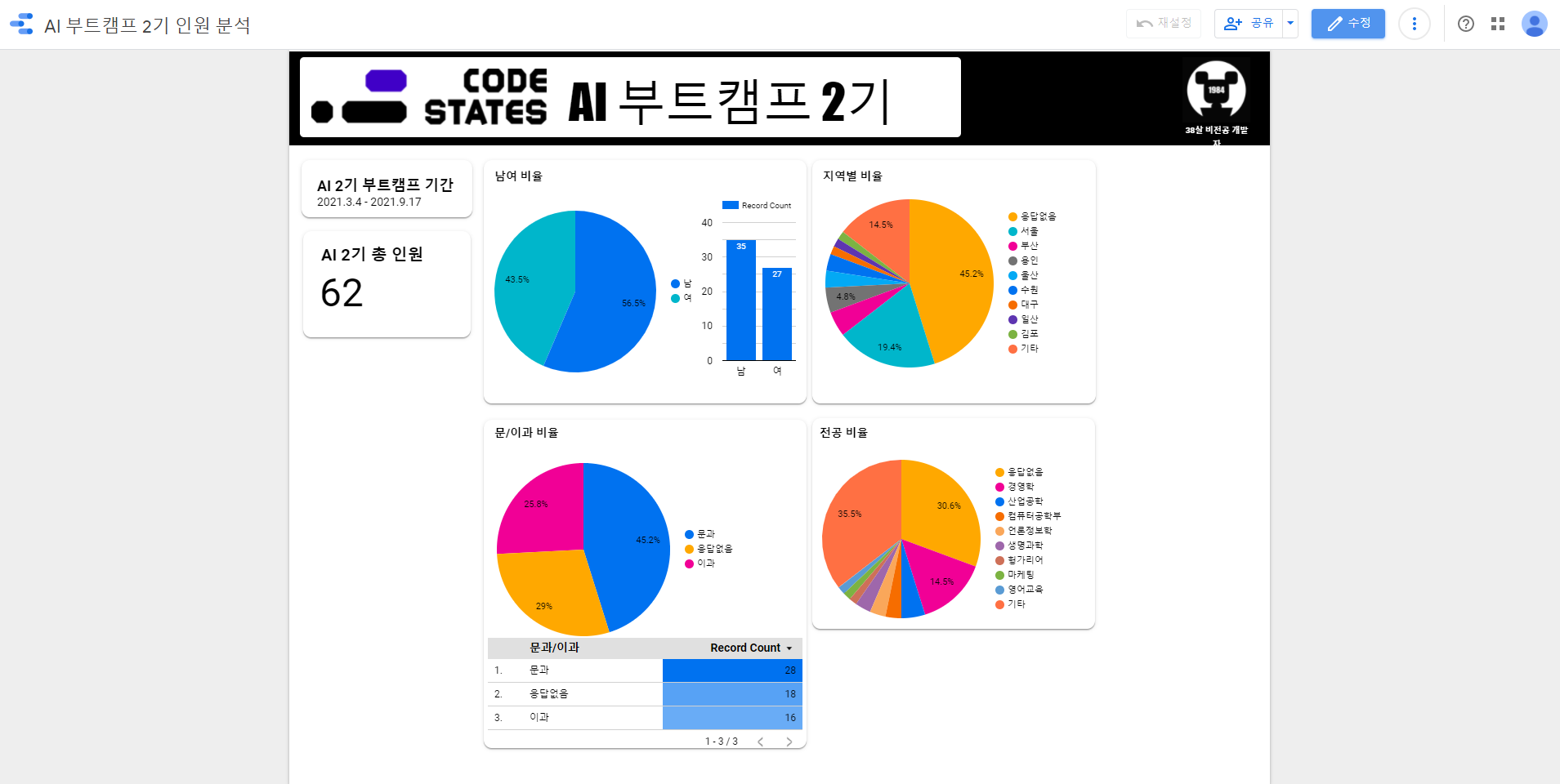 구글 데이터 스튜디오 (Google Data Studio) AI 부트캠프 2기 인원 분석